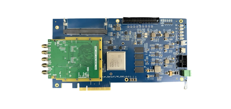 12位双通道500M同步数据采集卡采用FPGA载卡加ADC子卡的FMC架构形式。 FPGA载卡选用XILINX公司高性能FPGA作为核心处理单元,配备大容量DDR3内存与FLASH闪存,可通过PCIE2.0X8接口(数据传输速率达2GB/s)进行高速数据传输;系统集成了完善的时钟树、电源树、温度监测与IO扩展功能。 配备ADC子卡符合FMC LPC标准(VITA57.1), 搭载双片12位500Msps ADC芯片,板载温补晶振和PLL锁相环时钟分配器,支持外部时钟输入;ADC输入输出采用标准SMA接口,支持外部触发输入与内部触发输出。